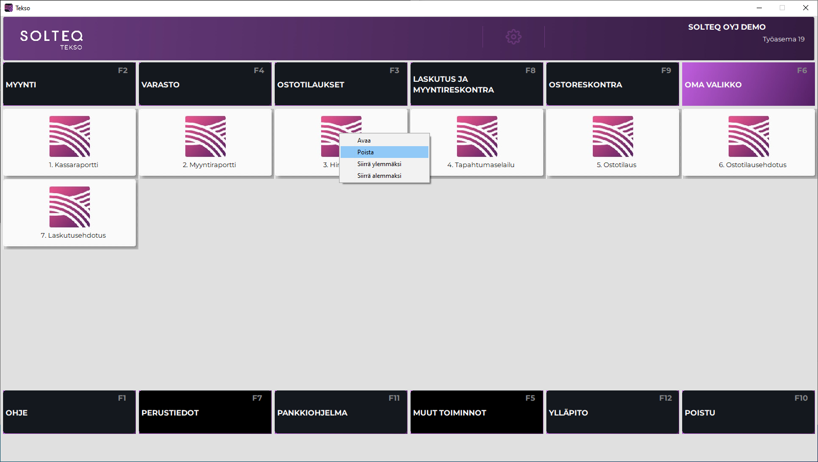 Voit rakentaa Teksoon oman valikkosivun, johon voit tallentaa yleisimmin käytössä olevat toiminnot. Näin voit nopeuttaa työskentelyä, kun eri moduuleiden toimintoja voi käynnistää suoraan omasta valikosta.