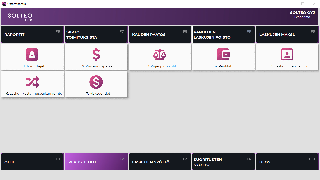 Toiminnolla annetaan ostoreskontran tarvitsemat perustiedot kuten toimittajat, kirjanpidon tilit ja maksuehdot. Toiminnot ovat osittain yhteisiä Tekson muiden osien kanssa. | |