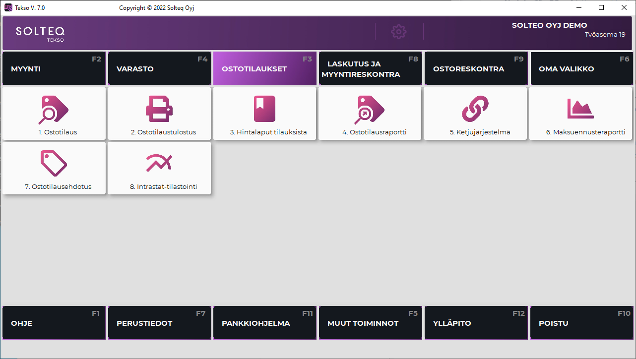 Tekson Ostotilaukset-valikko sisältää seuraavat toiminnot.