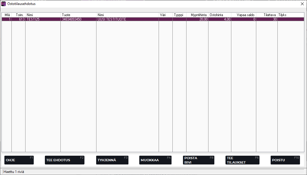 Kun haluat tehdä ehdotuksessa olevista riveistä ostotilaukset, käynnistä kyseinen oiminto painamalla F6 Tee tilaukset.