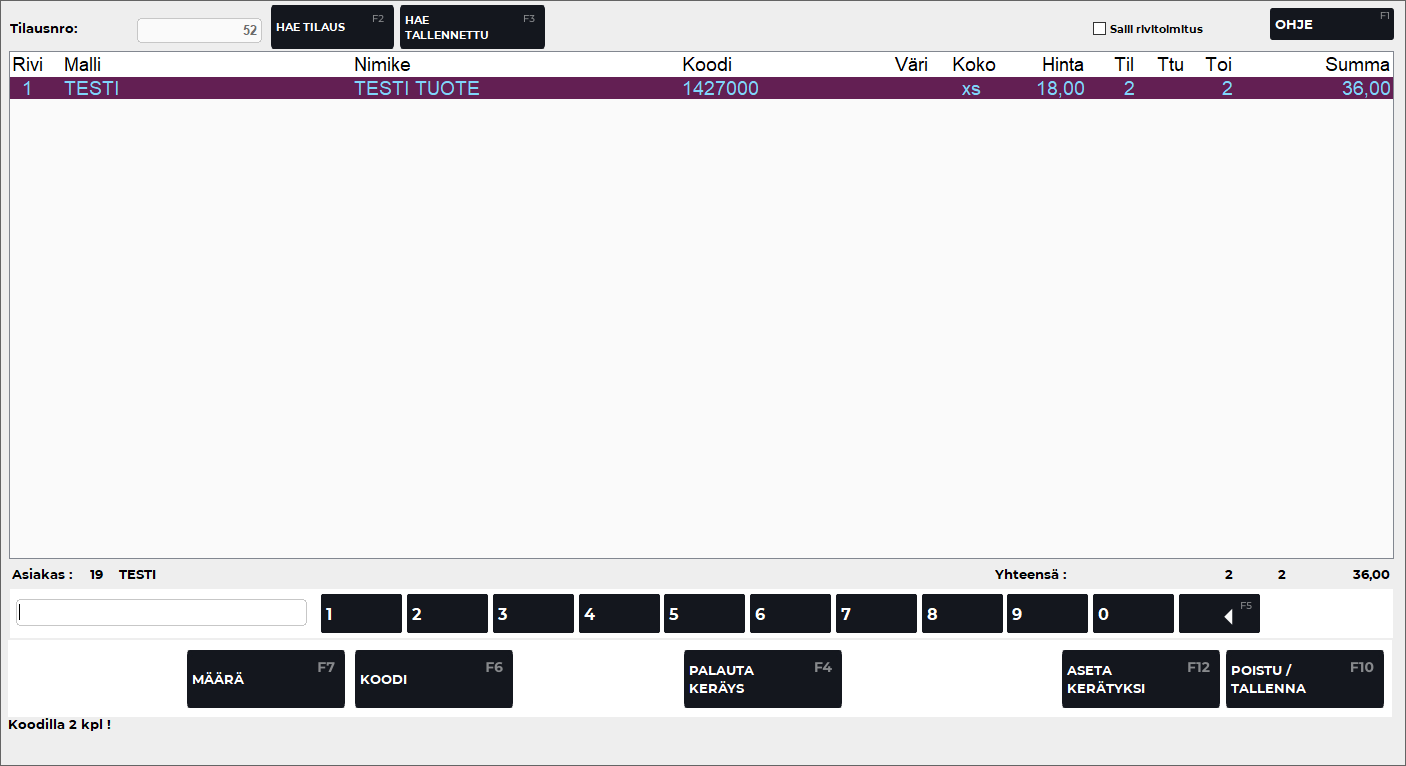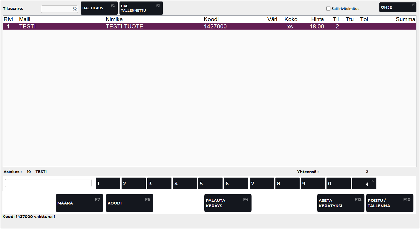 F2 Keräily -toiminnolla tai Enterillä valitaan tilaus keräilyyn.