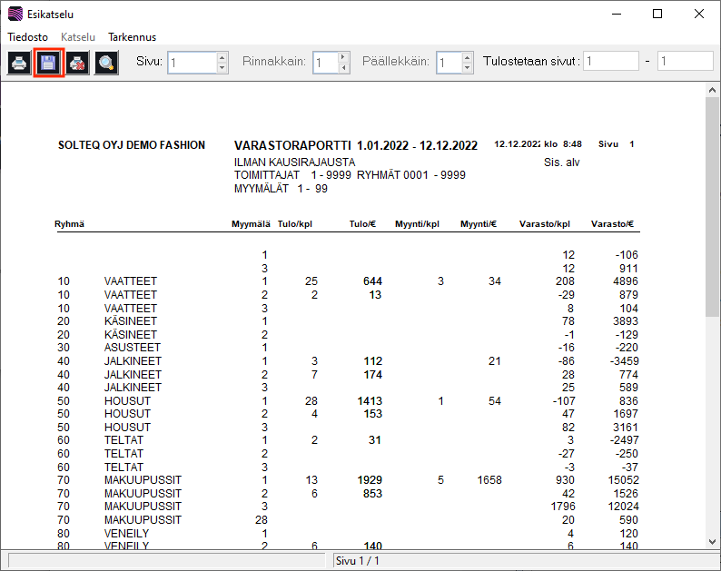 Tallenna-painike raportin esikatselussa (väri- ja kokolajitelma ei käytössä)