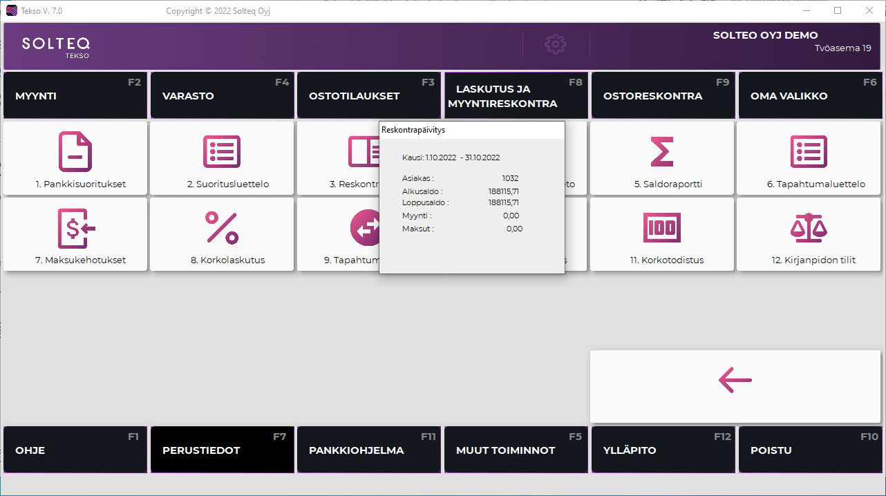 Ylinnä näkyy asiakasnumero, jota ohjelma käsittelee. Seuraavalla rivillä on alkusaldo, joka kertoo kuinka paljon läpikäytyjen asiakkaiden alkusaldo kauden alussa on. Loppusaldo näyttää kauden lopussa olevan saldon. Myynti-kentässä näkyvät asiakkaiden kauden aikana tekemät luotto-ostokset; kentän summa kasvaa koko ajan. Maksut-rivillä näkyvät kauden aikana olleet asiakassuoritukset.