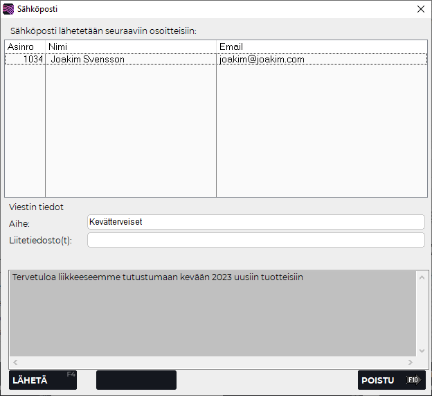 Lähetä ruudussa näkyville asiakkaaille sähköposti F4 Lähetä-painikkeella.