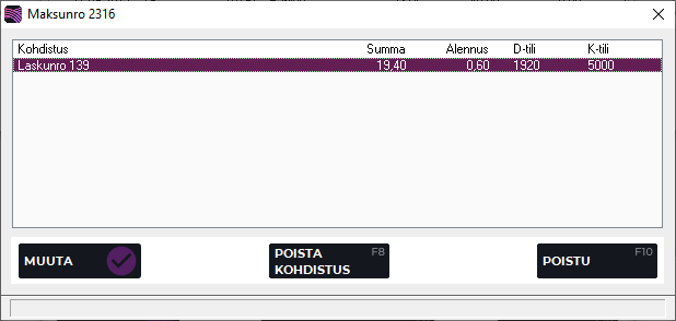 Maksunro-ruutu aukeaa, josta näkyy mihin laskuihin tai lähetteisiin suoritus on kohdistunut. Poista kohdistus F8 Poista kohdistus-painikkeella. Ohjelma pyytää sinulta tämän jälkeen vielä varmistuksen siitä, että kohdistus halutaan poistaa.