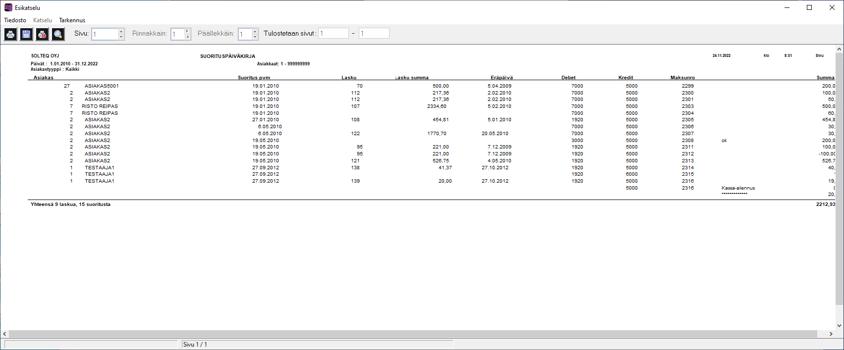 Suorituspäiväkirjalta nähdään, mihin laskuihin/myyntilähetteisiin suoritukset ovat kohdistuneet ja miten suoritus on kirjattu kirjanpidon tileille. Raportilla erotellaan myös mahdolliset kassa-alennukset. Raportilla näkyvät myös kohdistamattomat suoritukset.