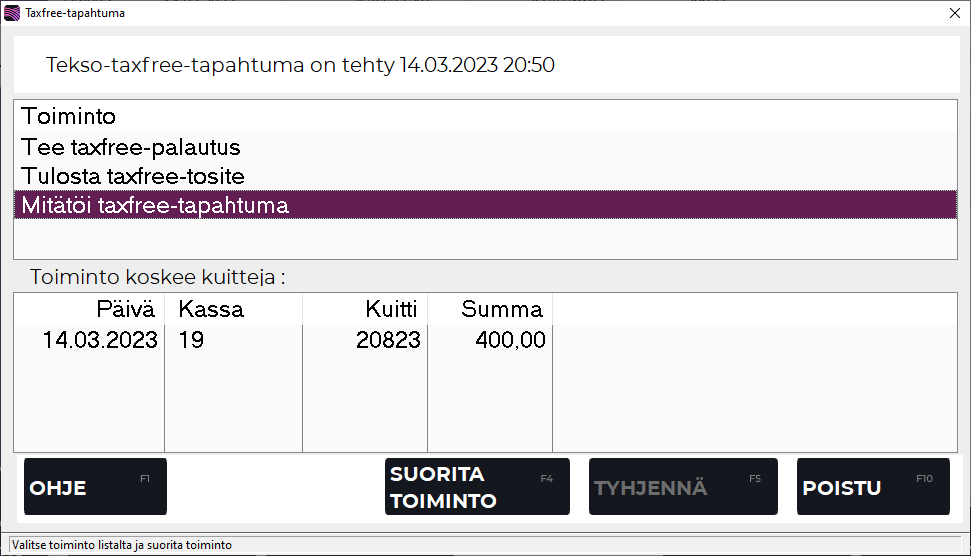 Ruudun yläosa sisältää tiedon, että tästä kuitista on aiemmin tehty tax free -tapahtuma. Valitse valikosta Mitätöi Tax free-tapahtuma -vaihtoehto ja paina F4 Suorita toiminto.