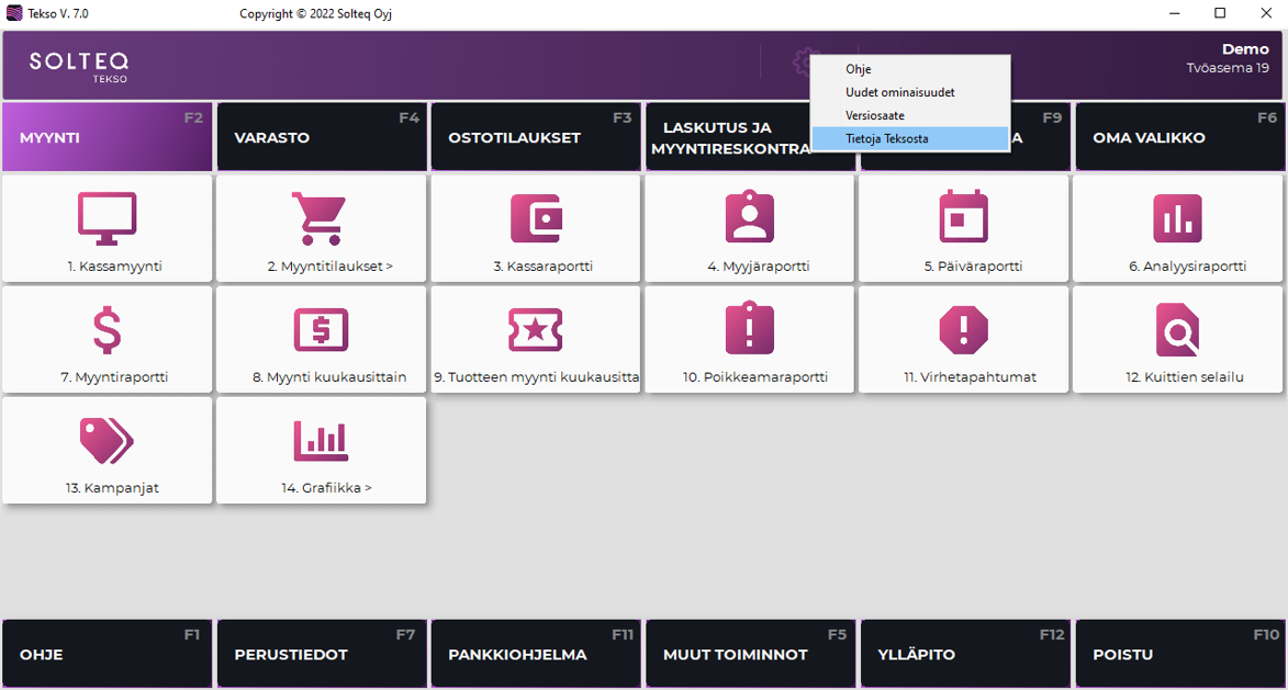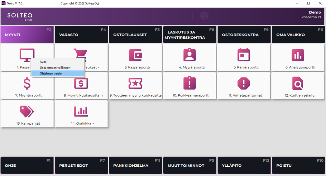 Version voi tarkistaa myös moduulikohtaisesti. Kun haluat nähdä esimerkiksi kassamoduulin versionumeron, valitse päävalikosta Kassa ja klikkaa hiiren oikealla painikkeella keskellä olevaa osasovellusta.
