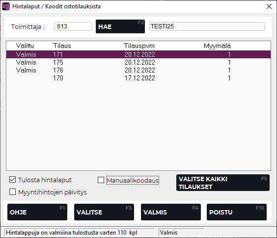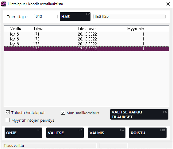 Valitse tilaus/tilaukset, joista haluat hintalaput jo ennen varastoontuloa painamalla F3 Valitse tai F5 Valitse kaikki tilaukset.