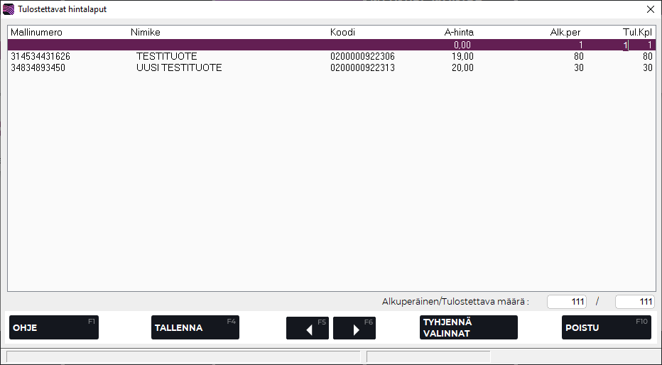 Käynnistä hintalappujen tulostus painamalla F4 Valmis.