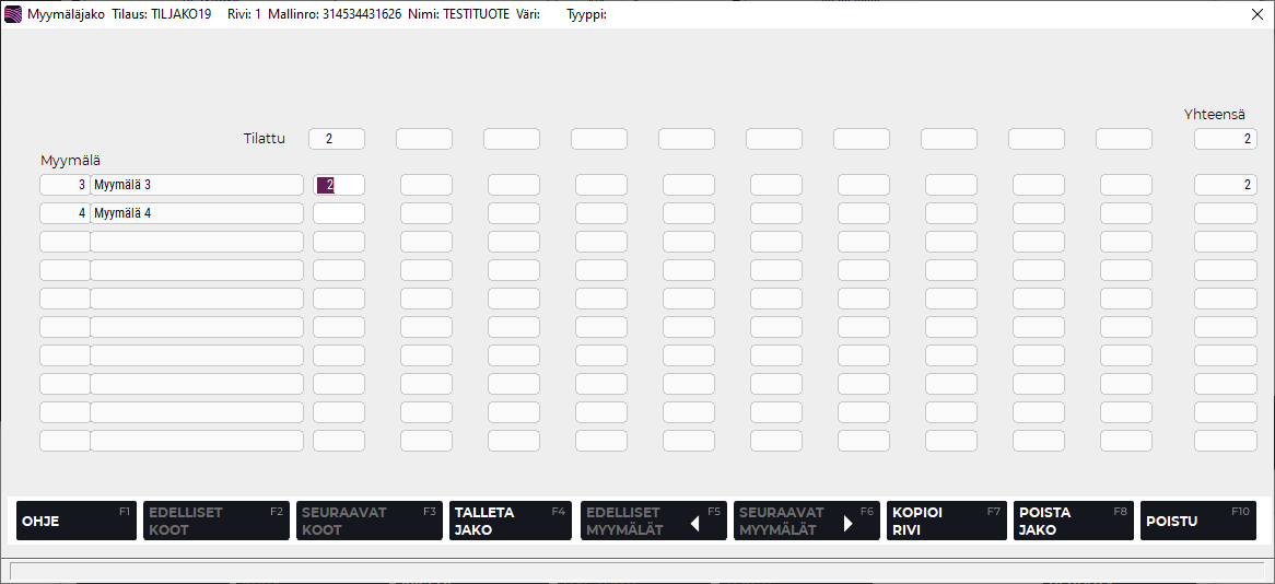 Painamalla F7 Kopioi rivi voit kopioida ensimmäisen rivin tilattavat määrät kaikille muille myymälöille.