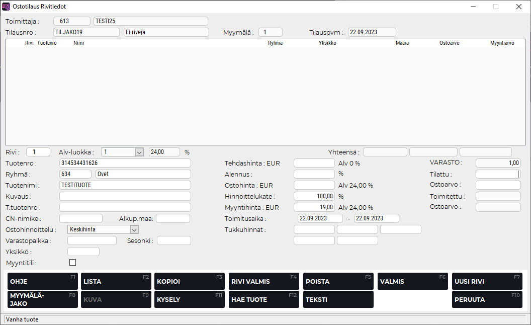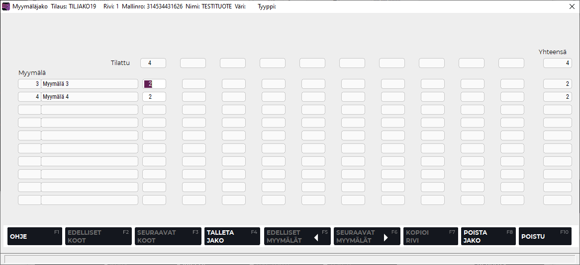 Tallenna lopuksi jako painamalla F4 Talleta jako, jolloin palaat Myymäläjako-ruudulta takaisin ostotilauksen rivitietoihin. Voit myös poistua tallentamatta tietoja (ohjelma pyytää varmistuksen tähän) painamalla F10 Poistu.