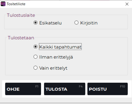 Painamalla F4 Tulosta voit tulostaa raportin valintasi mukaan esikatseluun tai suoraan kirjoittimelle
