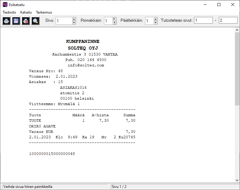 7. Paina F10 Poistu. Varauksesta muodostuu kuitti, jonka voi hakea kuittien selailun kautta. Varatut tuotteet kirjataan Varatuiksi.
