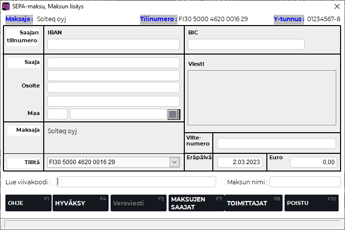 Tarkista aina alussa, että maksuissa käyttämäsi tili on oikea. Voit vaihtaa tilin painamalla F5 Vaihda maksajaa. Maksupankin vaihtaminen kesken tietojen syötön poistaa annetut tiedot.