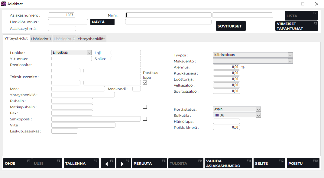Kun painat Asiakkaat-toiminnossa F3 Uusi -painiketta, pääset perustamaan uutta asiakasta.