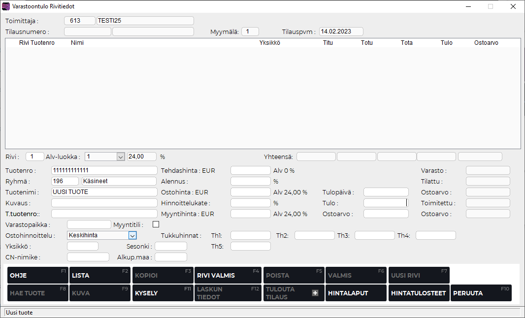 Varastoontulossa voidaan perustaa tuote, jota ei ennestään ole rekisterissä. Syötä tällöin Tuotenro-kenttään haluttu tuotenumero ja muihin kenttiin tarvittavat tiedot.