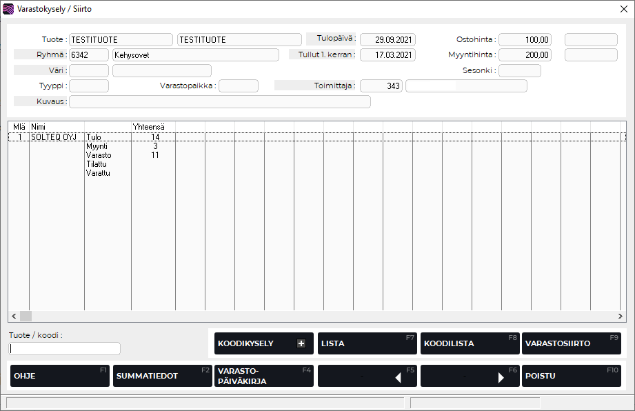 F2 Summatiedot | Tuo esille tuotteen Varastosaldot-ruudun, jossa näkyy varastotiedot kyseisestä tuotteesta kaikkien myymälöiden osalta yhteensä. |