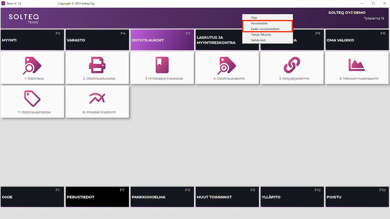 Tekson käyttöliittymän Viimeisin versiotiedote -linkistä avautuu nyt aina käytössänne olevan version tiedote. Valikosta löytyy myös Kaikki versiotiedotteet -linkki.