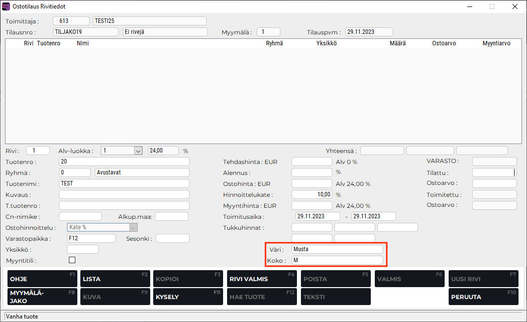 Väri- ja kokotiedot ostotilauksen rivitiedoissa