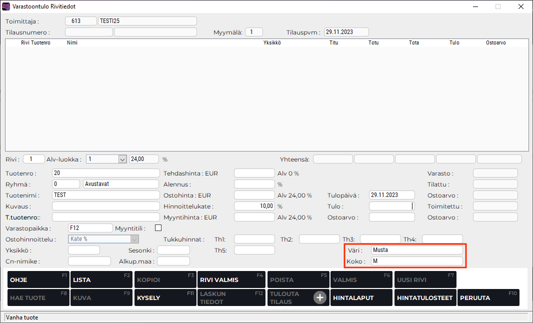 Tuotteen väri- ja kokotiedot näytetään myös varastoontulon sekä ostotilauksen rivitiedoissa, ja kyseisiä tietoja on myös mahdollista lisätä, muuttaa ja tallentaa tuotteelle rivitiedoissa.