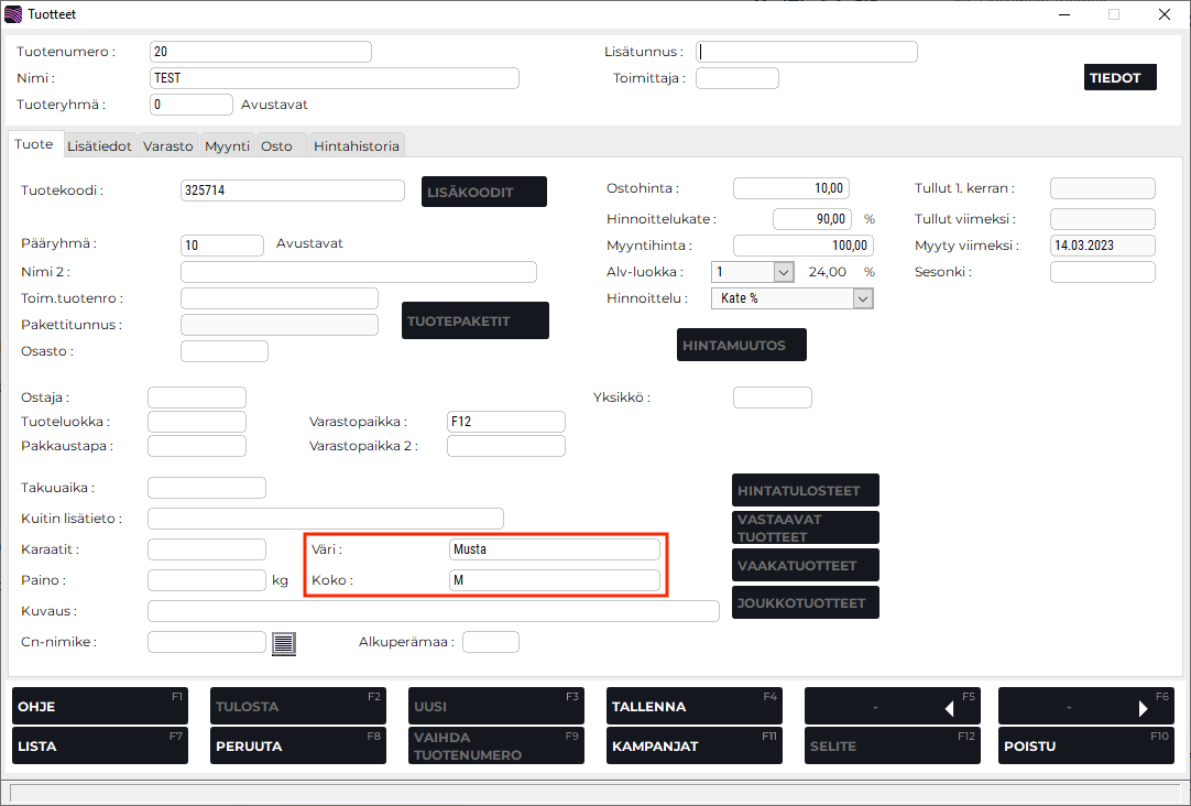 Tuotetiedoissa on nyt mahdollista ylläpitää tuotteen väri- ja kokotietoja: uudet Väri ja Koko-kentät on lisätty Tuote-välilehdelle.