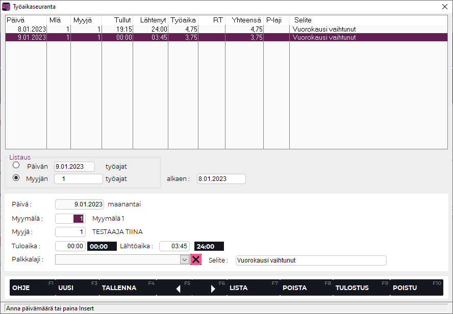Paina F4 Tallenna. Tämän jälkeen ohjelma laskee työaikaa näistäkin ajoista oletusparametrien mukaan.